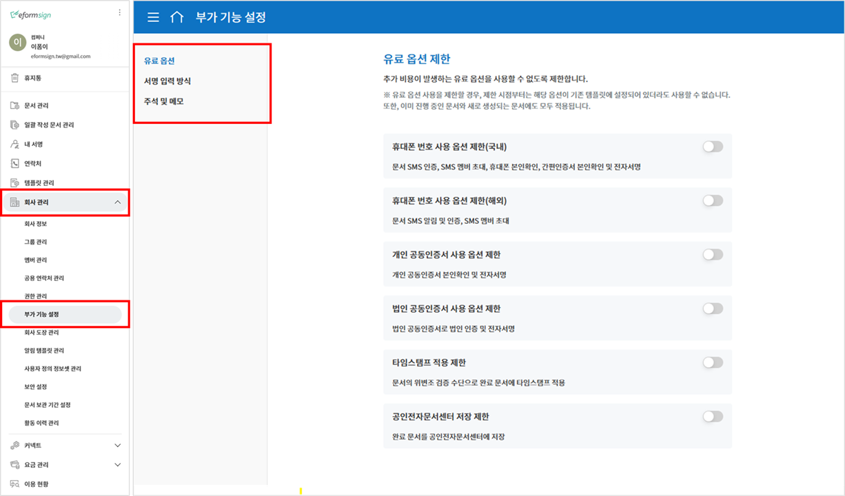 휴대폰 본인확인, 타임스탬프 등 추가 비용이 발생하는 옵션의 사용 여부를 설정할 수 있습니다. 기본 설정은 모든 옵션의 사용이 가능하며, 옵션 제한을 활성화(ON)하면 회사 전체, 모든 멤버에게 즉시 적용되어 해당 기능을 사용할 수 없습니다.