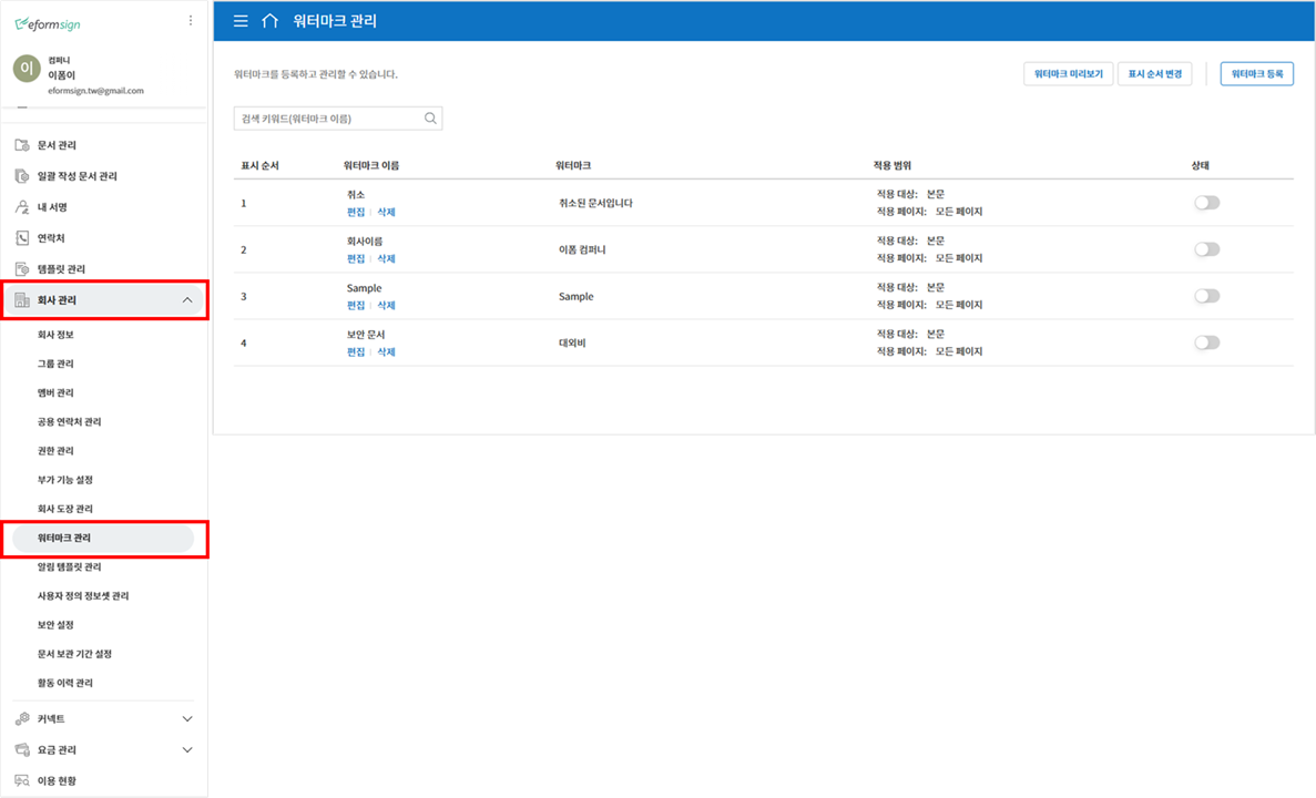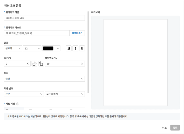 새로 등록한 워터마크는 기본적으로 비활성화 상태로 저장되며, 등록 후 목록에서 상태를 활성화 하면 모든 문서에 적용됩니다.