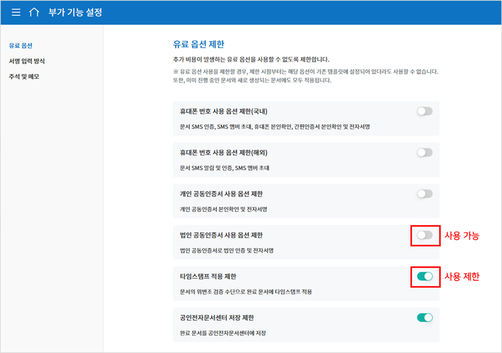 유료 옵션 사용을 제한할 경우, 제한 시점부터는 해당 옵션이 기존 템플릿에 설정되어 있더라도 사용할 수 없습니다. 또한, 이미 진행 중인 문서와 새로 생성되는 문서에도 모두 적용됩니다.