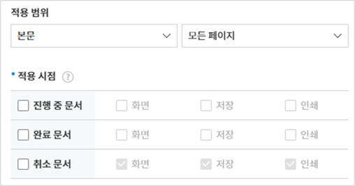 • 적용 범위: 본문, 첨부, 본문+첨부 중 선택, 모든 페이 또는 시작 페이지 중 선택