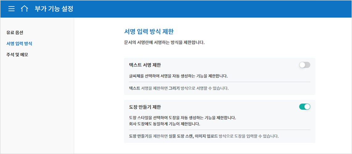 서명 방식 설정: 서명 시 서명 입력 방식을 제한 또는 허용할 수 있습니다. (텍스트 서명 및 도장 만들기 서명 입력 방식)