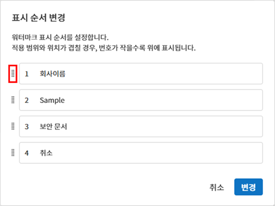 워터마크 관리 화면 우측 상단의 표시 순서 변경 버튼을 클릭한 후, 표시 순서 변경 팝업에서 순서를 변경할 워터마크를 드래그하여 위치를 변경합니다.